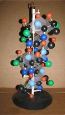 Модель представляет собой имитацию участка белковой молекулы, на котором можно рассмотреть структуру белка и взаимное расположение атомов в белковой молекуле. Модель позволяет рассмотреть первичную и вторичную структуры белка, химические связи между атомами в молекуле и между пептидами, из которых и собирается белок. Атомы разных химических элементов, из которых строится белковая молекула, обозначены на модели разным цветом и отличаются по размеру. Так, атом углерода обозначен шариком черного цвета, к нему присоединяется атом водорода оранжевого цвета, атом азота обозначается на модели шариком голубого цвета, а атом кислорода – синего. Участок пептида (аминокислоты) не принимающий участия в образовании химических связей в молекуле белка – радикал – обозначается на модели шариком зеленого цвета. Модель подвижно закреплена на металлическом штыре с подставкой. При объяснении материала учитель может перемещать цепочку полипептида вокруг оси, что позволит учащимся более детально разобраться в изучаемом вопросе. Высота модели не менее 47 см.