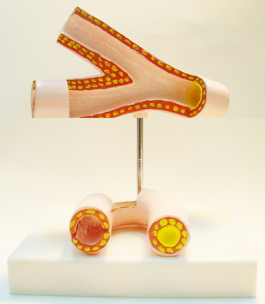 С помощью этой модели можно продемонстрировать изменения внутри кровеносных сосудов, вызванные артериосклерозом: от сосудов с незначительными бляшками до полного забитого сосуда. Длина модели не менее 17 см