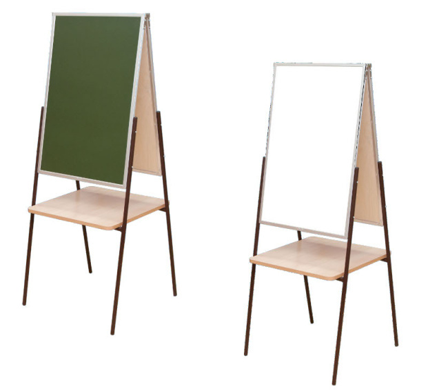 Мольберт имеет две рабочие поверхности, выполненные из стального эмалированного листа, который обеспечивает высокую износоустойчивость и прочность. Одна из которых предназначена для письма мелом, другая - маркером. Рабочая поверхность для письма мелом имеет матовое антибликовое покрытие для четкой видимости изображений, рамка рабочих поверхностей выполнена из стального профиля, окрашенного стойкой полимерной краской. Мольберт позволяет работать как непосредственно мелом и маркером, так и на ватмане, закрепленном на поверхности магнитами. Каркас мольбертов изготовлен из стальных труб круглого сечения, имеет порошковое покрытие, стойкое к химическим и механическим воздействиям. Внизу рабочих поверхностей имеются лотки, для мела, магнитов и других необходимых принадлежностей. Мольберт при необходимости складывается и занимает небольшое количество места при хранении.Габариты мольберта в сложенном состоянии 1405х570х65 мм, в разложенном виде 1380х570х500 мм.