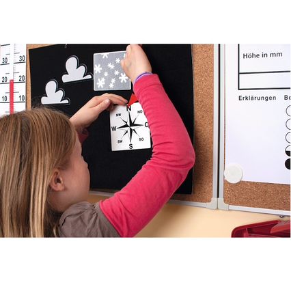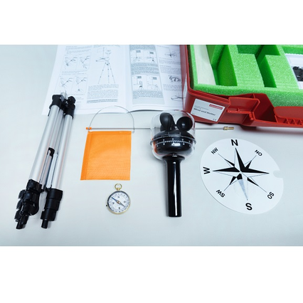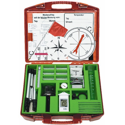 В наборе (для 6 рабочих групп)*: термометр (от -25 С до +50 С) максимально-минимальный демонстрационный, компас, картушки компаса, чаша анемометра, телескопическая тренога, флюгер и металлическое зеркало, емкости для сбора воды, карта наблюдения за погодой, пластиковые карточки с условными обозначениями погодных факторов, а также для записи температуры и осадков, аксессуары.