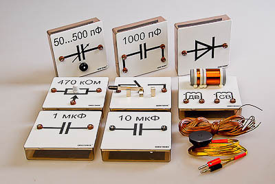 Комплектность: модуль конденсатора на 10 мкФ – 1 шт., модуль конденсатора на 100 мкФ – 1 шт., модуль конденсатора на 1000 мкФ – 1 шт., модуль катушек на 250 и 1000 витков – 1 шт., модуль резистора на 10 Ом – 1 шт., модуль резистора на 22 кОм – 1 шт., модуль светодиода – 1 шт., модуль низковольтной лампочки – 1 шт., модуль переключателя на два положения – 1 шт., металлический цилиндр – 1 шт., руководство по эксплуатации – 1 шт.