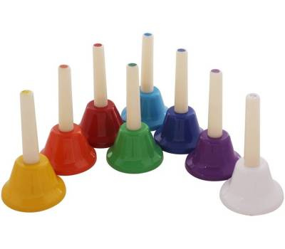 В наборе 8 цветных колокольчиков, каждый из которых настроен на определенную ноту.