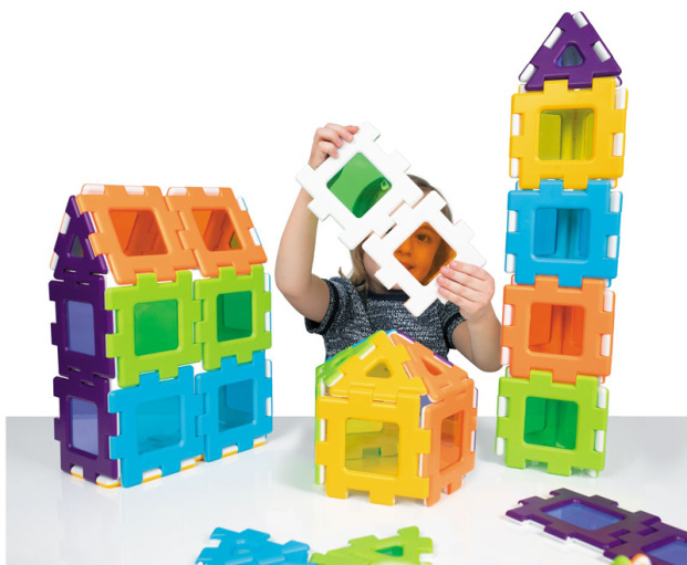 При помощи этого конструктора дети в процессе игры смогут уже в раннем возрасте развить пространственное мышление, осваивая работу с двух- и трёхмерными фигурами. Включает в себя две главные геометрические фигуры — квадрат и треугольник 5 цветов (желтый, голубой, зеленый, оранжевый, фиолетовый). Цветные детали были разработаны, чтобы помочь детям исследовать смешивание цветов и строительство в увлекательной форме, выглядят эффектно на светлом столе или против источника света.