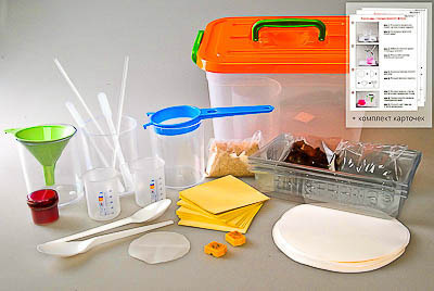 Комплектность: стакан прозрачный пластиковый – 3 шт.; стакан прозрачный пластиковый с отверстиями – 1 шт.; стаканчик пластиковый мерный 50 мл – 2 шт.; сетка – 2 шт.; магнит – 2 шт.; пластиковая ложка – 2 шт.; шпатель – 2 шт.; порошок железа металлического – 1 упаковка; краска – 1 шт.; воронка – 1 шт.; палочка стеклянная – 2 шт.; бумажный фильтр – 1 упаковка; сито – 1 шт.; цветная бумага – 1 упаковка; поднос прозрачный – 3 шт.; песок отмытый – 1 упаковка; торф – 1 упаковка; лист белой бумаги ламинированный – 3 шт.; карточки с пошаговым описанием работ 1–5 – по 3 шт.; контейнер пластиковый – 1 шт.; руководство по эксплуатации - 1 шт.; учебное пособие «Комплект для исследования состояния окружающей среды» (автор И.Л. Марголина – 40 страниц – печать офсетная, обложка полноцвет.) – 1 шт.