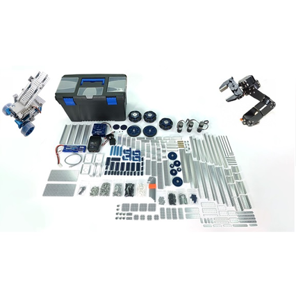 В состав комплекта входит: конструктивные элементы из металла и пластика – 700 шт., контроллер моторов – 1 шт., моторы с энкодером - 3 шт., мотор-редукторы – 2 шт., сервопривод большой – 8 шт., сервопривод малый – 2 шт., инфракрасный датчик - 3 шт., ультразвуковой датчик – 3 шт., датчик температуры - 1 шт., датчик освещенности - 1 шт., датчик линии – 2 шт.,набор электронных компонентов (резисторы, конденсаторы, светодиоды различного номинала), комплект проводов для беспаечного прототипирования, плата беспаечного прототипирования, аккумулятор и зарядное устройство.