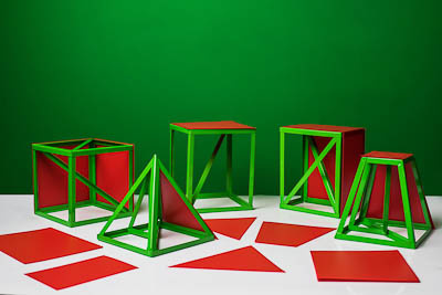 Набор состоит из 5 геометрических тел, ребра которых выполнены из металлических уголков, и пластиковых пластинок, обозначающих грани.