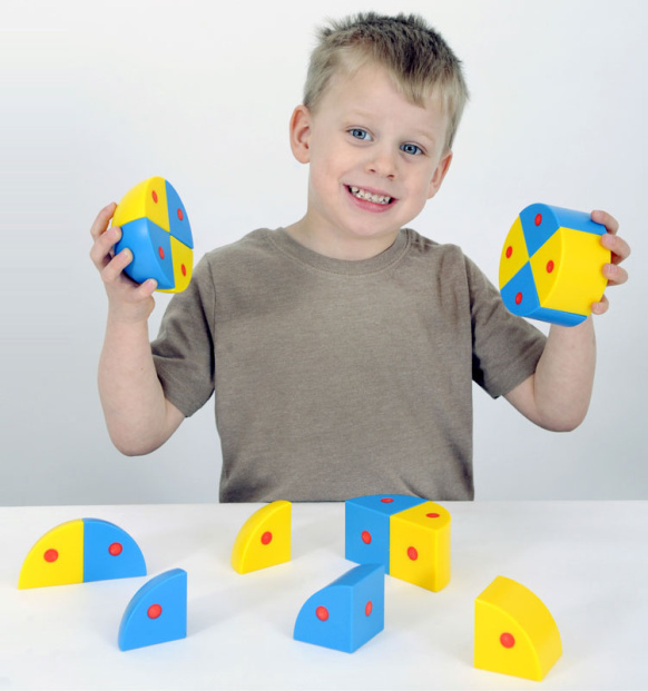 Состав набора: 4 части сфер голубого цвета, 4 части сфер желтого цвета, 4 части цилиндра голубого цвета, 4 части цилиндра желтого цвета.