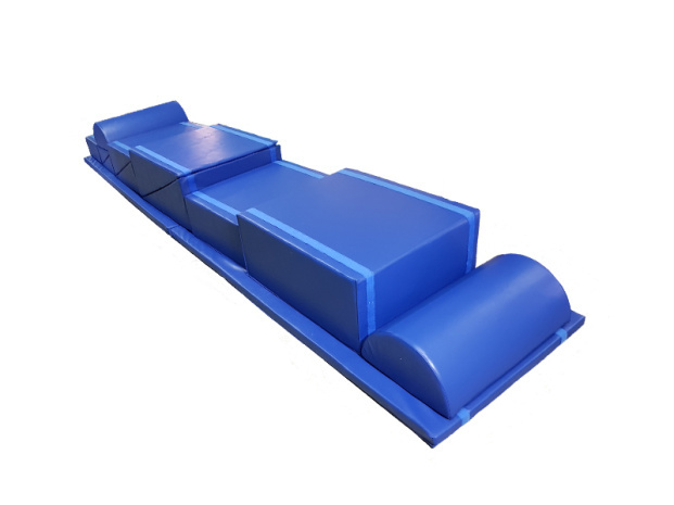 В комплект входит 2 мата- основы и 11 матов различной конфигурации: мат 250*100*5см - 2шт; мат в форме прямоугольного параллелепипеда 100*80*40см - 1шт; мат в форме прямоугольного параллелепипеда 75*80*30см - 1шт; мат в форме прямоугольного параллелепипеда 50*80*20см -1шт; мат в форме треугольной призмы 100*80*40см - 2шт; мат в форме треугольной призмы 75*80*30см - 2шт; мат в форме треугольной призмы 50*80*20см - 2шт; мат в форме полувалика 50*80*25см - 2шт.