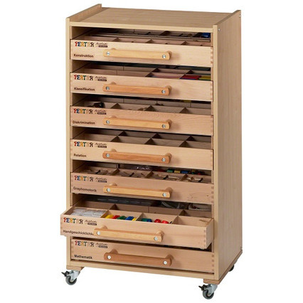 Мобильный стеллаж для размещения чемоданов с наборами. Обеспечивает быстрый доступ к дидактическому материалу, простоту обзора и подбора необходимого для занятий материала.