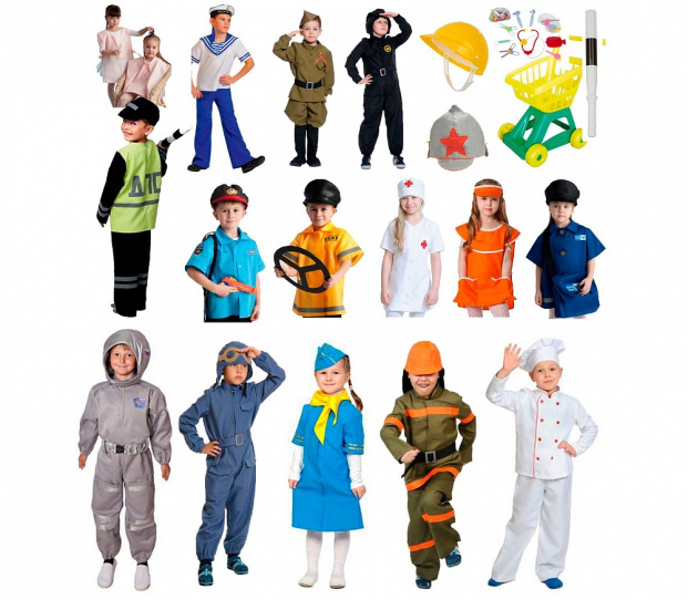 В наборе не менее 5 костюмов представителей разных профессий (врач, пожарный, полицейский, повар, солдат, почтальон и т.п.), соразмерных росту ребенка. Материал: текстиль, пластмасса.