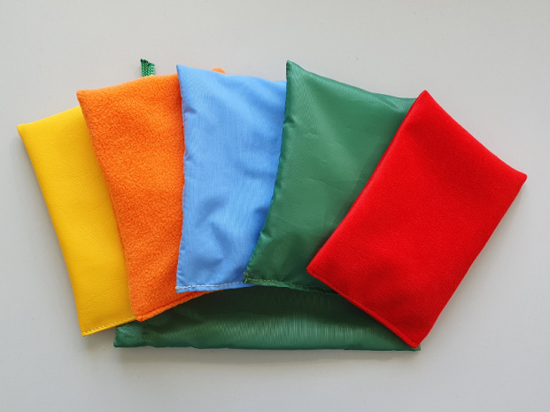 В наборе 10 шт. (по 2шт каждого цвета) размером: 10*15 см, вес 100 гр. и сумка для хранения. Мешочки изготовлены из различных по плотности и текстуре тканей с шариками ПЭТ внутри.