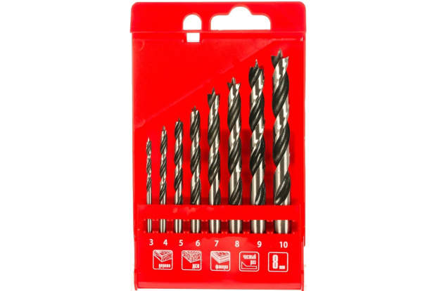 Набор сверл по дереву с цилиндрическим хвостовиком, 8 шт. в упаковке, позволяет получать отверстия диаметром 3-4-5-6-7-8-9-10 мм в древесине любой твердости.