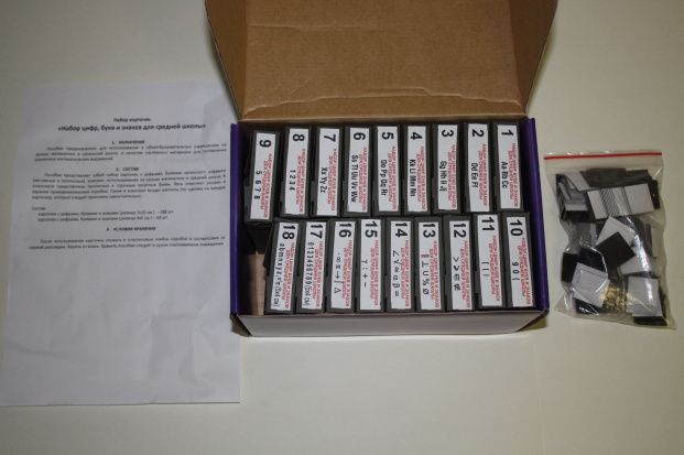 Набор предназначен для использования в общеобразовательных учреждениях на уроках математики и физики в средней школе, при составлении различных математических и физических выражений и формул. Комплектность1. Карточки-литеры размером 70x95мм – 264шт.2. Карточки-литеры размером 40x50мм – 64шт.3. Магниты на клейкой основе - 1комплект4. Паспорт - 1шт.5. Список цифр, букв, знаков – 1шт .6. Коробка складная с решётками – 1шт. Характеристики изделияВ комплект входят карточки-литеры разного размера, на которых отпечатаны цифры, буквы латинского алфавита и математические знаки, используемые для составления различных математических выражений. Для каждой карточки в наборе предусмотрена магнитная резина на клейкой основе. С карточками может работать как сам учитель (подготавливая примеры для контрольных работ), так и учащиеся, при составлении по заданию учителя тех или иных математических выражений. Карточки и магниты уложены в ячейки картонной складной коробки. Коробка упакова