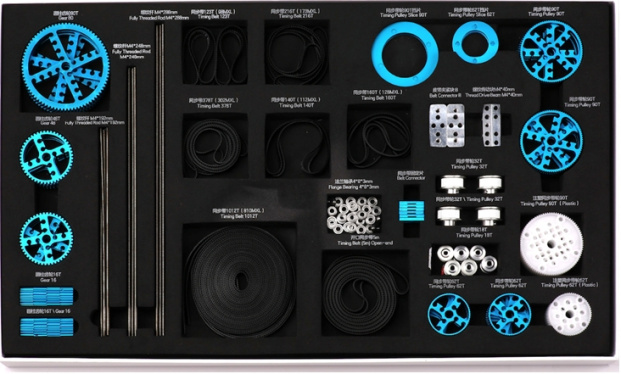 Набор шестерней, зубчатых колес и приводных ремней для создания различных видов зубчатых и ременных передач.
