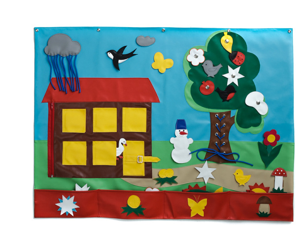 Настенные панно интересная и занимательная дидактика, расширяет кругозор ребенка, развивает мелкую моторику рук. С помощью дидактических панно малыши учатся навыкам самообслуживания, узнают что такое форма, цвет, размер, дети узнают что такое цифра и какие они бывают, счет и количество.Дидактический набор включает в себя: дачный домик, съемные элементы: ласточка, облако,снегирь, воробей, божья коровка, гусь, снеговик, птенец,звездочка, насекомые,цветок,гриб