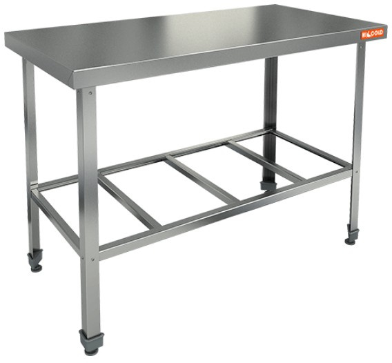 Стол центральный с полкой решеткой. Материал столешницы нержавеющая сталь AISI430 (0,8 мм). Тип столешницы - усиленная ДСП. Материал каркаса оцинкованная сталь (0,8 мм). Тип каркаса - уголок 40х40 мм. Распределённая статическая нагрузка на стол 120 кг. Распределённая статическая нагрузка на полку 50 кг. Изделие поставляется в разборе.