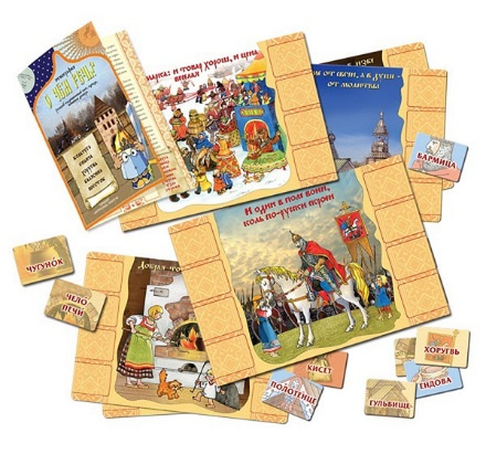 В комплекте: 10 сюжетных зарисовок о русском быте, 80 карточек лото со словами, книжка с описанием сюжетов.Почему наша игра начинается со слов «О чём речь»?. Потому что мы сначала знакомимся со значениями старых русских слов, рассматриваем сюжетные картинки из жизни наших прадедов, обращаем внимание на пословицу, подобранную к каждому сюжету и читаем его небольшое описание в книжке. А уж потом – играем в лото. И в игре вспоминаем, что же значит слово «епанча»? где находится «шесток»? может ли полотенце быть «резным»? Наши рассказы – о воинских доспехах и русском костюме, о жилищах и храмах, о том, что окружало наших предков в далёкие времена.