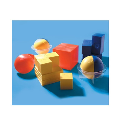 В наборе: 1 большой и 4 малых куба, 4 квадратные пластины, 4 параллелепипеда, сфера с подставкой. Сферу можно разделить на две равные части. Доля каждой части обозначена обыкновенной дробью, десятичной дробью и процентами.