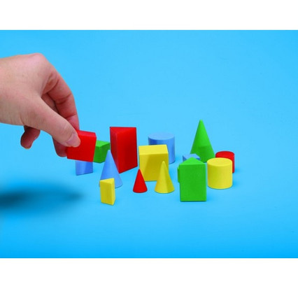 В набор входят геометрические тела четырех форм: куб, призма, цилиндр и конус, каждый из которых поставляется в четырех разных размерах и цветах (всего 16 тел).