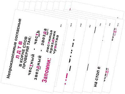 Комплектность: 1. Разбор предложения по членам предложения. 2. Порядок разбора состава слова. 3. Однокоренные слова, форма слова. 4. Состав слова. 5. Непроизносимые согласные. 6. Сочетание “СН” без “Т”. 7. Правописание приставки. 8. Правописание предлога. 9. Суффиксы. 10. Сочетание “ЧК”, “ЧН”. 11. Разделительный “Ъ”. 12. Род имени существительных. 13. Число имен существительных. 14. Мягкий знак у существительных после шипящих. 15. Род имени прилагательных. 16. Число имен прилагательных. 17. Безударные окончания имен прилагательных. 18. Неопределенная форма глагола. 19. Время глагола. 20. “НЕ” с глаголами. 21. Сводная таблица правил корня. 22. Части речи.