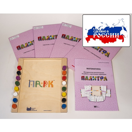 Палитра - универсальное пособие для работы с последующей самопроверкой. Карточка с заданием накладывается на деревянную основу (приобретается отдельно). Ребенок берет в руки фишку, соответствующую заданию, ищет подходящий ответ и кладет фишку в углубление рядом с этим ответом. При проверке карточку переворачивают, снова кладут на палитру и затем проверяют, совпадают ли цвет и форма фишек с раскраской по краям заданий.