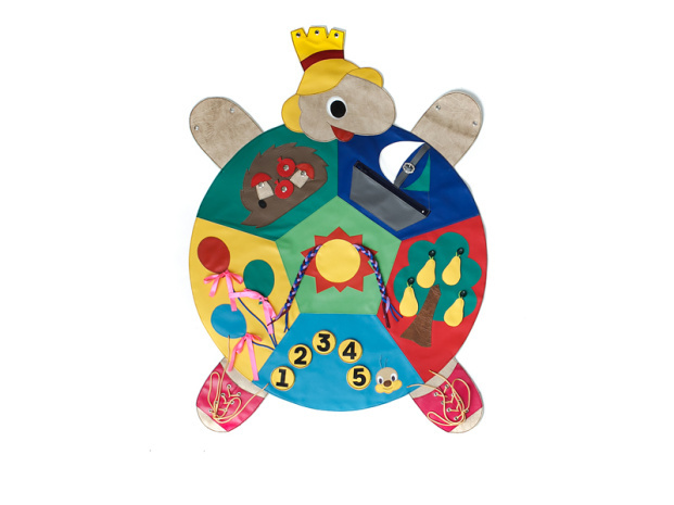Предназначено для развития мелкой моторики и изучения счета. С помощью панно дети учатся застегивать кнопки, пуговицы, пряжки, молнии, шнуровать, плести косички и завязывать банты из лент. Имеется карман для съемных элементов.