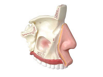 Модель высотой около 15 см изготовлена из пластмассы. Модель изображает строение носовой полости человека. Модель раскрашена в естественные цвета.