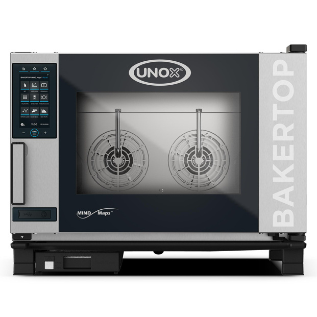 Пароконвектомат электрический UNOX XEBC-04EU-EPLM серии BakerTop MIND.Maps PLUS используется для выпечки кондитерских и хлебобулочных изделий и приготовления гастрономических блюд в пекарнях, кондитерских, ресторанах, столовых, на фабриках-кухнях, предприятиях торговли. Модель оснащена 9,5” емкостной сенсорной панелью управления MASTER.Touch, позволяющей создавать и сохранять до 384 программ, и интегрированным подключением Wi-Fi.