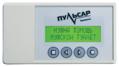 Приемник со звуковой, световой, текстовой индикацией и вибросигналом. Приемник обладает двухстрочечным экраном, на котором в текстовой форме отображается информация о месте расположения кнопки, с которой пришел вызов.