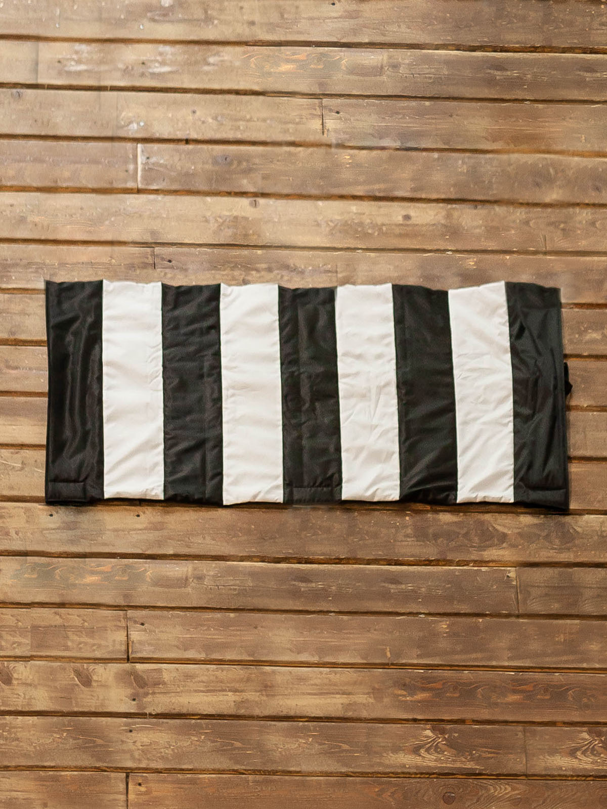Материал — 100% полиэстер. Верх — 5 черных полос, 4 белых. Низ — черный. Прокладка — синтепон.