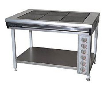 Плиты электрические предназначены для тепловой обработки полуфабрикатов в функциональных емкостях, варки, жарки, тушения и пассерования на предприятиях общественного питания. Исполнение ПЭ–0,54СП: плита шестиконфорочная без жарочного шкафа. Рабочий стол плиты и лицевые панели из н/стали; каркас из черного металла с полимерным покрытием.