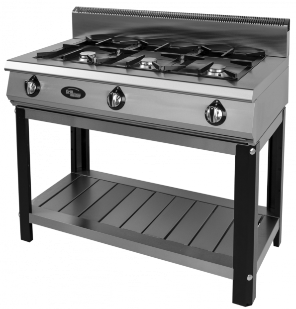 - Плита имеет 3профессиональныегорелкикласса Heavy Duty и газ-контроль всех горелок плиты.