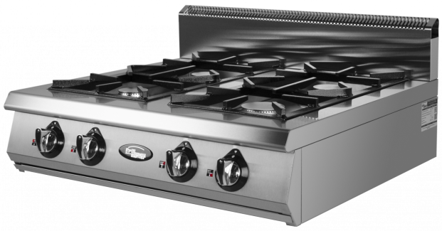 - Плита имеет 4 профессиональныегорелки класса Heavy Duty и газ-контроль всех горелок плиты.