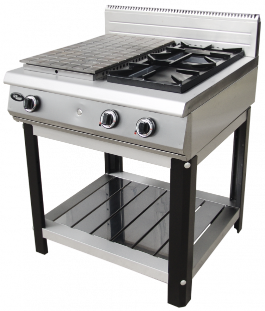 Плита газовая комбинированная на подставке, 2 горелки с запальной системой розжига класса Heavy Duty (1х6.5, 1х9 kW), 1 специальная горелка закрытого горения, 1 стальная варочная панель, открытая подставка с полкой, полностью из н/стали.