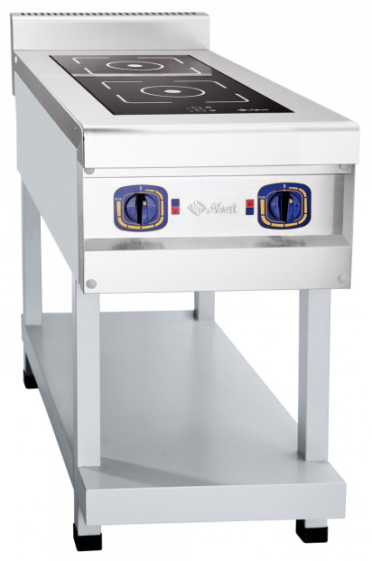 Двухконфорочная индукционная плита КИП-2П для приготовления первых, вторых и третьих блюд в наплитной посуде. Используемая посуда должна обладать магнитными свойствами (к ней должен притягиваться магнит) и иметь плоское дно. Может использоваться посуда из нержавеющей стали или алюминия с ферромагнитным дном, чугунная посуда. Стеклокерамическая рабочая поверхность толщиной 6 мм, плавная регулировка температуры нагрева от 60 до 240 °С, режим увеличенной мощности — BOOST, диаметр посуды мин. 115 мм, макс. 300 мм, защита от скачков напряжения. Лицевая панель из нержавеющей стали. Крашеные: подставка с полкой, боковые и задняя панели.