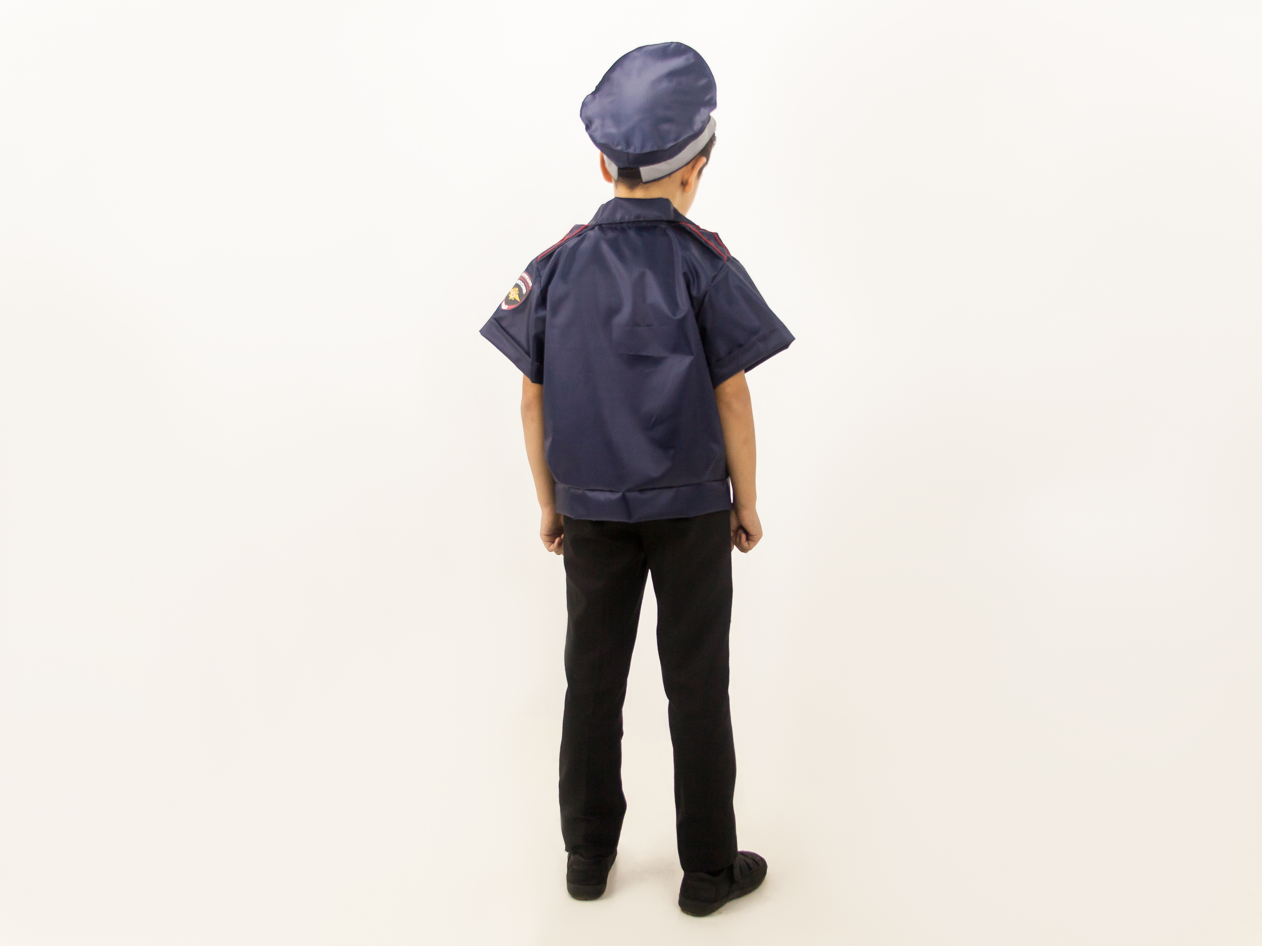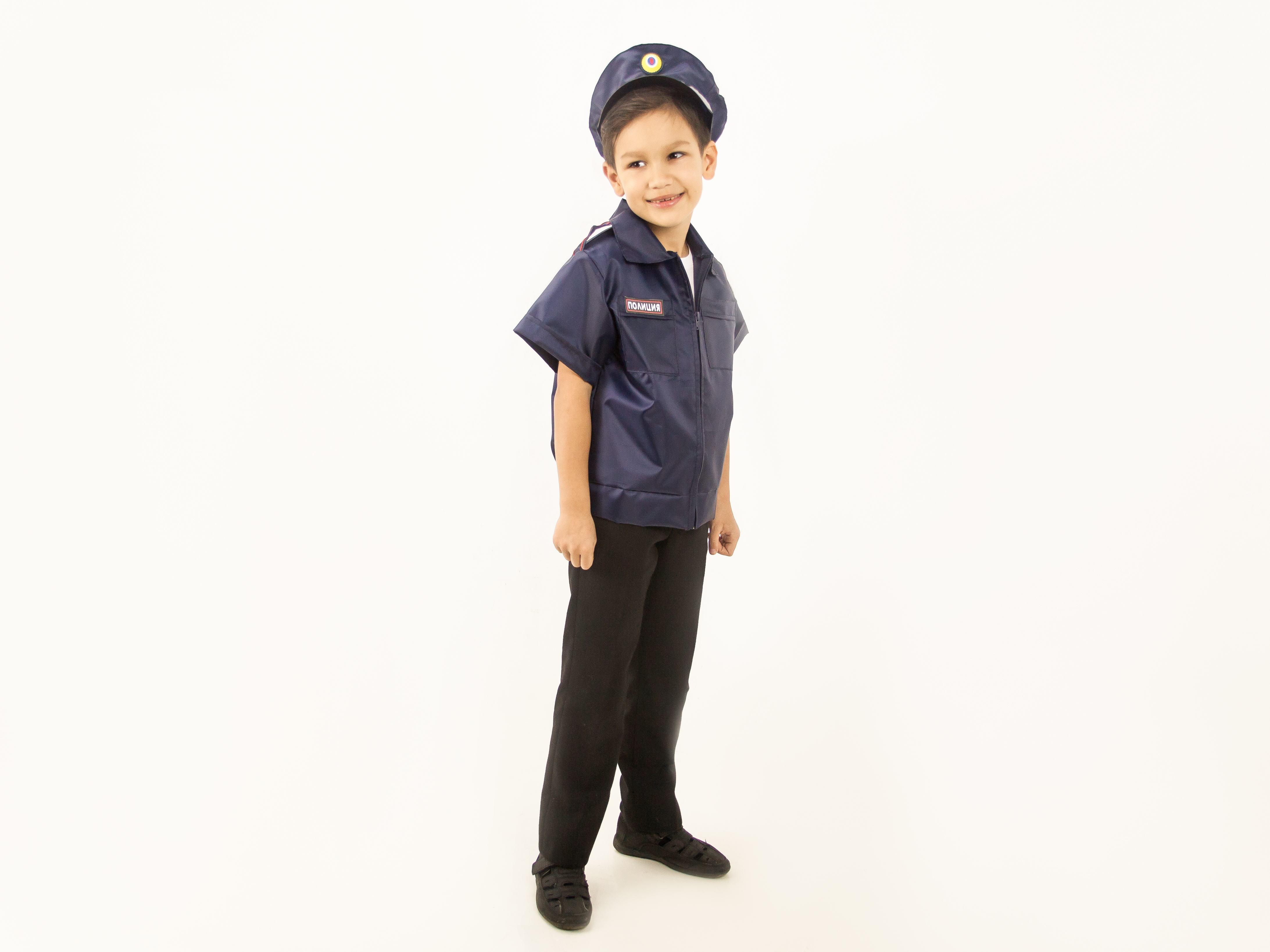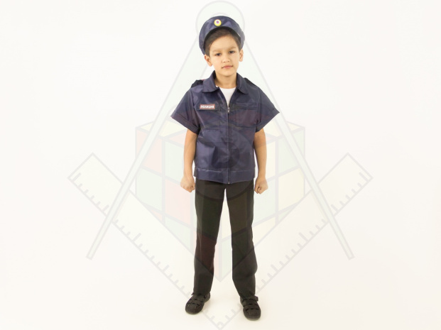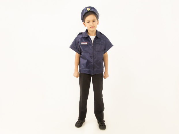 Материал: 100% полиэстер. Комплектация: 2 предмета - куртка и головной убор. Куртка с коротким рукавом, воротником, поясом по низу, застегивается на молнию спереди, два нагрудных кармана, на одном надпись "полиция", шеврон на рукаве. Головной убор с козырьком, кокардой, светоотражающей полосой, сзади резинка для регулировки по размеру.