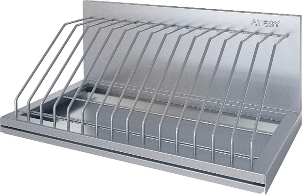 Полка кухонная АТЕСИ ПКК-С-300.350-6-02 серии «стандарт» предназначена для сушки и хранения крышек кастрюль, баков в моечных отделениях, горячих цехах. Материал полки – нержавеющая сталь AISI 430. Полка имеет 6 отделений, выполненных из нержавеющего прутка (сталь AISI 304), для размещения крышек диаметром от 160 до 500 мм. Внизу предусмотрен съемный поддон для сбора остатков воды. Полка может размещаться на стене или на столе.