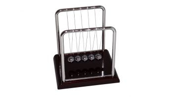 Прибор состоит из основания, закрепленных на нем вертикальных опор и горизонтальных стержней, к которым на нитях подвешены пять шаров равной массы.