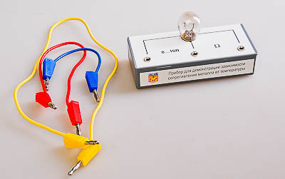 Прибор представляет собой двухспиральную электрическую лампу с патроном, смонтированным на пластмассовой подставке, на которой также установлены универсальные зажимы для подключения регулируемого по напряжению источника тока (может использоваться источник питания демонстрационный ИПД-С или В-24) и омметра. Максимальное напряжение питания нагревательной спирали – 12 В.