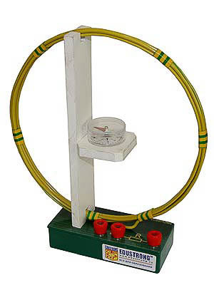 Прибор состоит из катушки диаметром 0,21 м (6 витков провода), компаса и резистора; установлен на подставке.