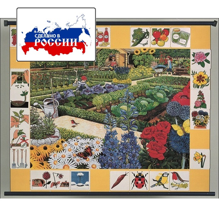 В комплекте рулонный магнитный пластиковый плакат, иллюстрированные и текстовые карточки (128 магнитных карточек в коробке), наклейки для текстовых карточек. В Методических рекомендациях приводятся описание учебного комплекта, план приусадебного участка, общие дидактические замечания.