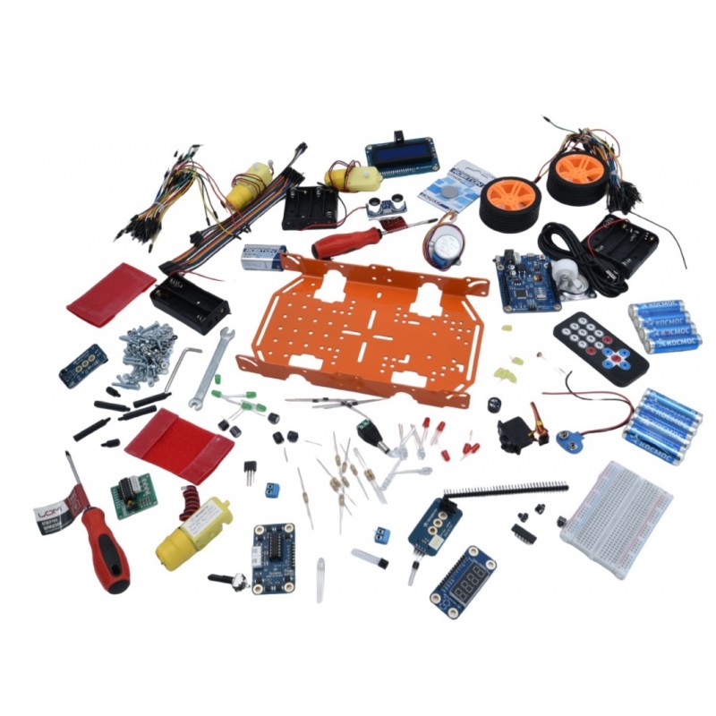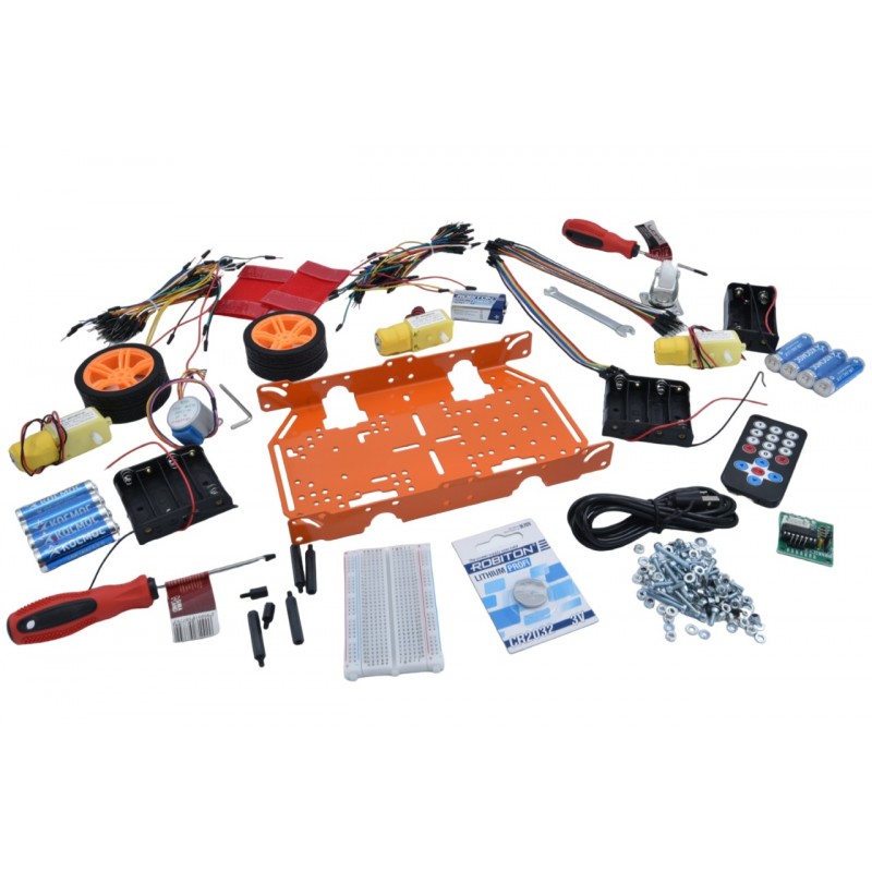 Расширенный набор Робот+ — это конструктор с беспрецедентно богатым набором деталей, электронных компонентов и устройств для максимально полного освоения возможностей программируемых контроллеров, созданных на основе платформы Ардуино. В формате увлекательных уроков рассматривается работа с отдельными электронными компонентами, микросхемами и такими интересными устройствами, как жидкокристаллический экран, цифровой индикатор, инфракрасный пульт управления, сервопривод, электродвигатель, различные датчики и многие другие элементы. А венчает учебный курс сборка настоящего колесного робота и обучение его выполнению различных задач, которые связаны с ориентированием и перемещением в пространстве.