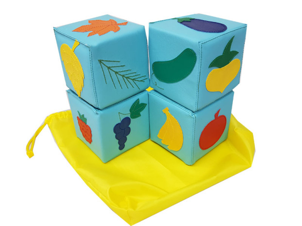 Набор состоит из 4-х мягких кубиков и сумки. Каждый кубик с тематическим изображением: - овощи, - фрукты, - ягоды. - листья. Кубики предназначены для изучения окружающего мира, классификации, обобщения в понятия фрукты, овощи, ягоды, листья и закрепления знаний о них. Вспомните с детьми все названия, где растут, выделите вкусовые и внешние особенности, сгруппируйте по цвету, найдите различие и сходство. Сыграйте в «где что растет», «кто что ест» и не забудьте построить башню!