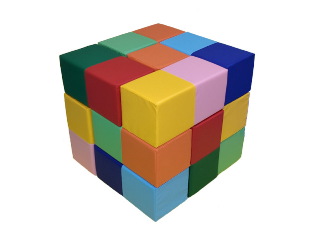 Набор состоит из 13 двухцветных брусков разных цветов в собранном виде образующих куб размером 60х60х60 см. Модульный набор «Разноцветные кубики» может использоваться в детских спортивных и игровых зонах, в детских садах и дошкольных учреждениях. Мягкий игровой набор позволяет детям развивать пространственное и логическое мышление, смекалку и умение различать цвета. Дети дошкольного возраста могут собрать куб в произвольной форме. Для детей школьного возраста задачу можно усложнить и попросить собрать кубик так, чтобы каждая грань фигуры состояла только из одного цвета.