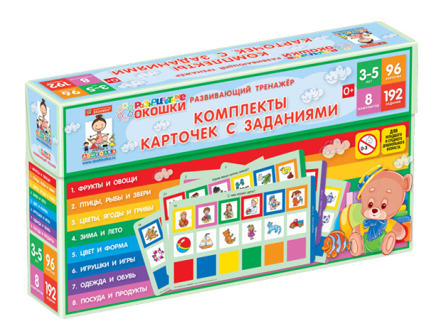 Комплектация: Набор состоит из 8 комплектов тематических карточек для среднего дошкольного возраста, каждый комплект состоит из 12 двухсторонних карточек, содержащих 24 задания по темам.