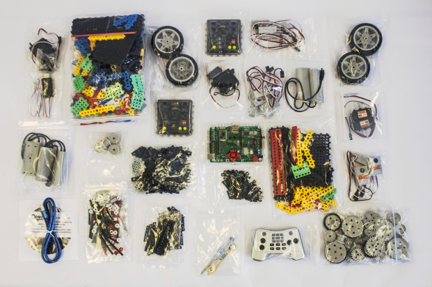 В состав набора входит 667 элементов. 3 материнских платы для начадьного, среднего и продвинутого уровня, 2 двигателя постоянного тока, 2 сервомотор, 6 видов датчиков. Пластиковые балки, колеса, шестеренки светодиоды и муфты. Возможность соединения блоков с 6 сторон позволяет создавать большие объемные конструкции за короткое время.