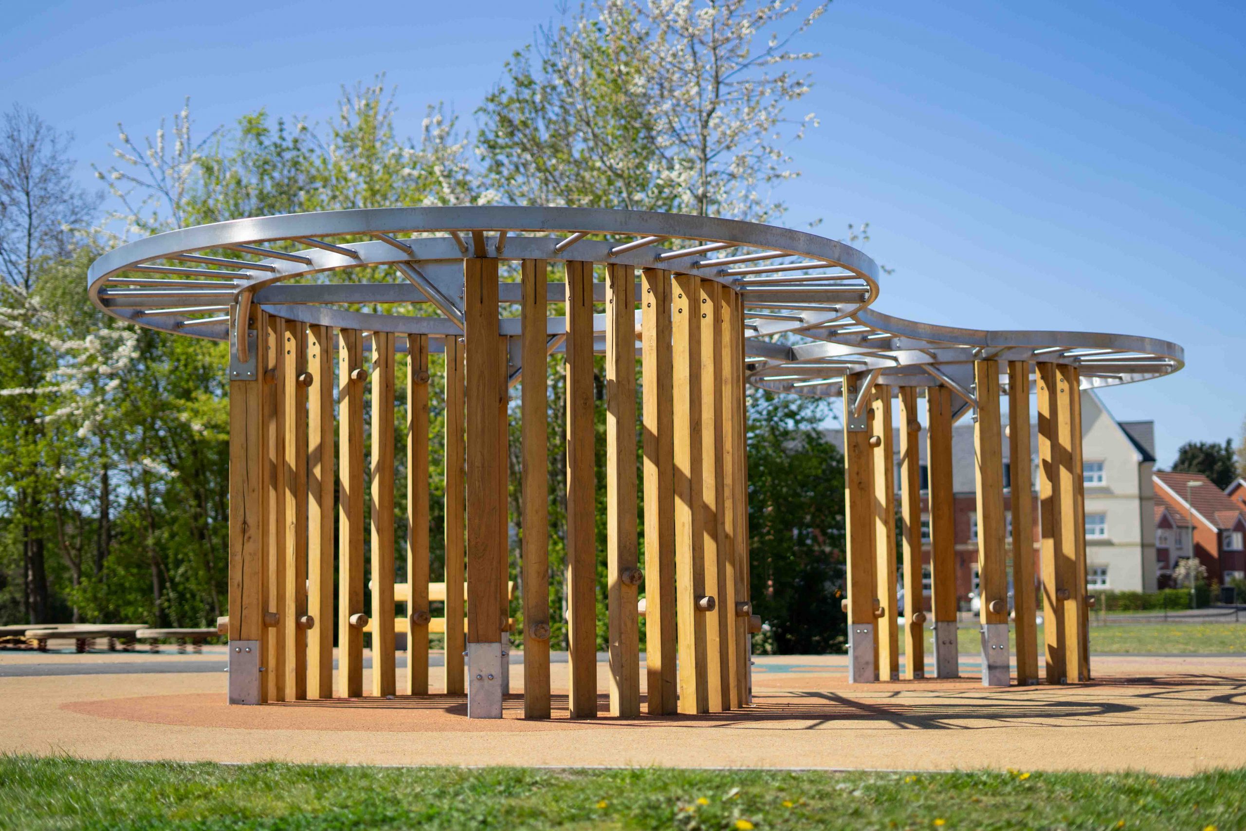 Цельный массив хвойных пород древесины, тщательно отшлифованный, с антибактериальной обработкой и цветным/бесцветным покрытием. Металлические элементы выполнены из нерж.стали, закладные элементы (под бетонирование в грунт) - сталь.