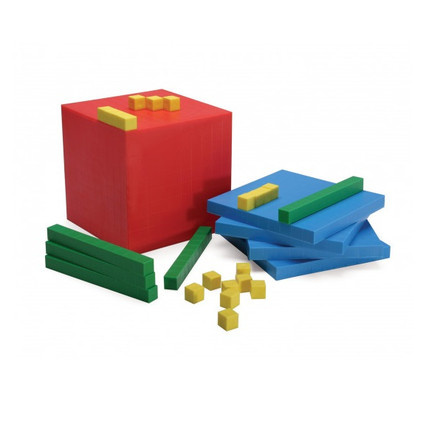 Набор предназначен для демонстрации соотношений между единицами, десятками, сотнями и тысячами. Каждый элемент разделен на кубические сантиметры, что еще более подчеркивает соотношение с разных элементов. В комплекте 100 желтых кубиков (единицы), 50 зеленых (десятки), 30 голубых пластин (сотни) и 4 красных куба (тысячи).