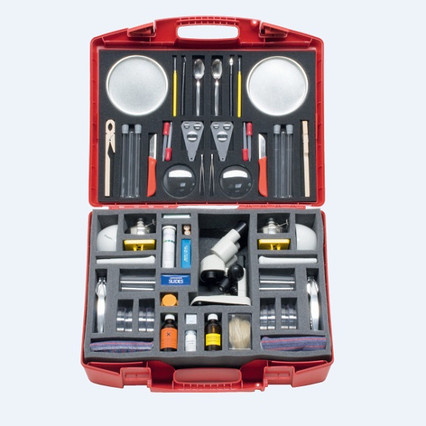 В комплекте (для 2 рабочих групп)*: тарелка, трехлинзовая лупа, пипетка, пинцет, иглы, штатив для пробирок, пробирка, горелка, стереоскоп, аксессуары.