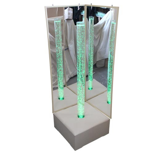 Эффект заключается в множестве поднимающихся на поверхность пузырьков воздуха. Подсветка колонны и поднимающихся пузырьков осуществляется разными цветами с большим разнообразием оттенков светодиодными матрицами. Зеркальный уголок усиливает эффект. Если прислониться к колонне - можно почувствовать легкую вибрацию.